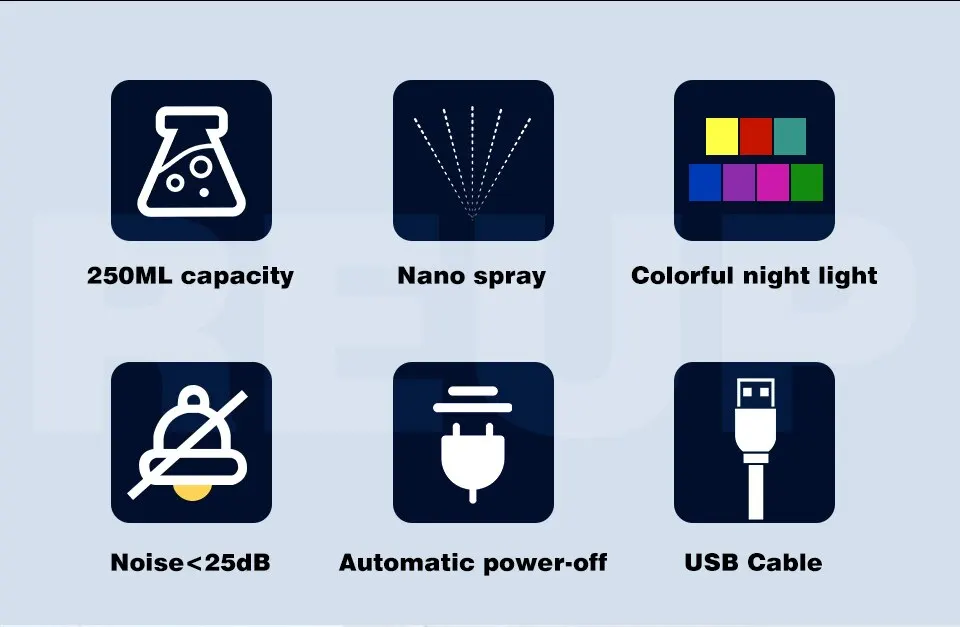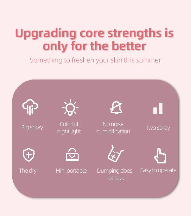 6. Nano Spray: soft and fine mist, soft and refreshing ultrasonic molecular atomization, fine water molecular spray, continuously moisturizing continuously, moisten every inch of skin.
